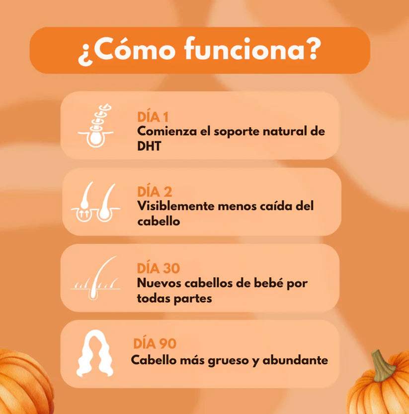 El aceite de semilla de calabaza y el extracto de saw palmetto son dos ingredientes ampliamente estudiados por su papel en el equilibrio hormonal y la salud capilar. El primero aporta zinc y antioxidantes que estimulan el crecimiento del cabello, mientras que el segundo ayuda a reducir la debilidad capilar vinculada al desequilibrio hormonal. Al combinarse en una fórmula prensada en frío, se conservan intactas sus propiedades, ofreciendo resultados reales y seguros sin recurrir a químicos ni tratamientos invasivos.