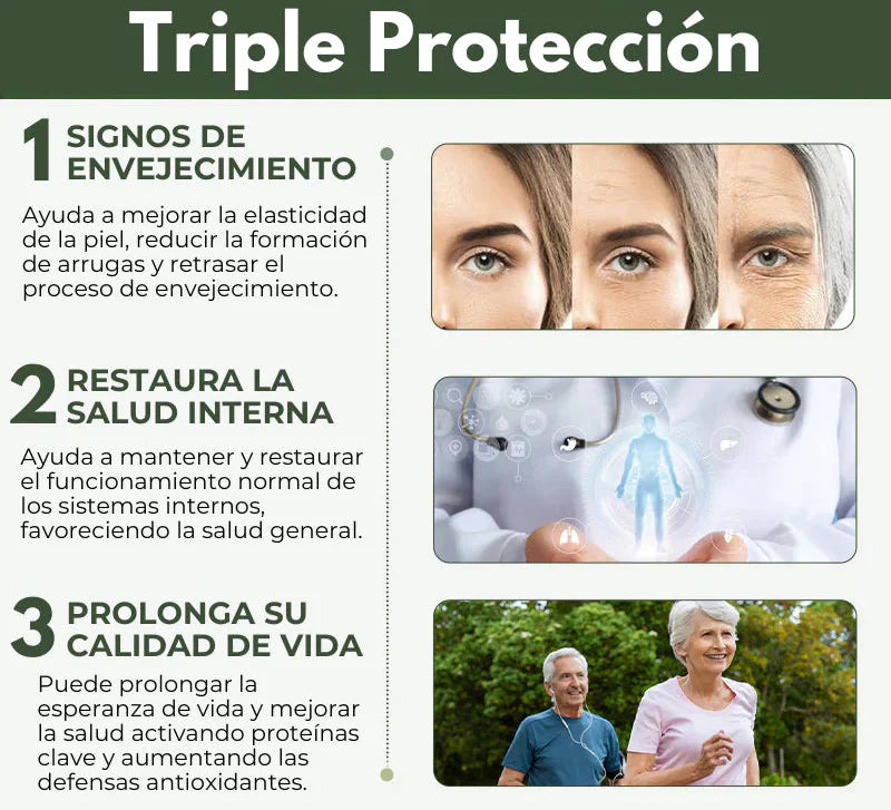 A diferencia de otros suplementos, actúa tanto en el aspecto externo como en las funciones internas del organismo, promoviendo un rejuvenecimiento profundo y duradero.
