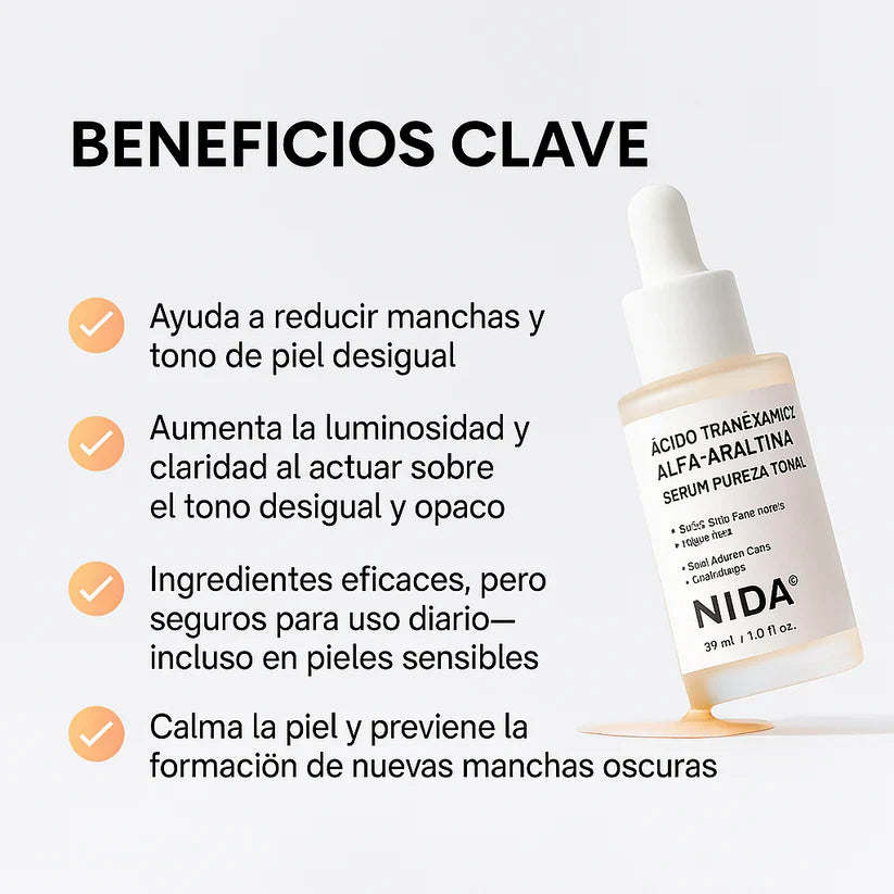 NIDA® Serum trabaja para restaurar el equilibrio natural de la piel desde el primer uso. Su fórmula de grado clínico regula el exceso de sebo, hidrata en profundidad y refina la textura sin dejar sensación grasa.